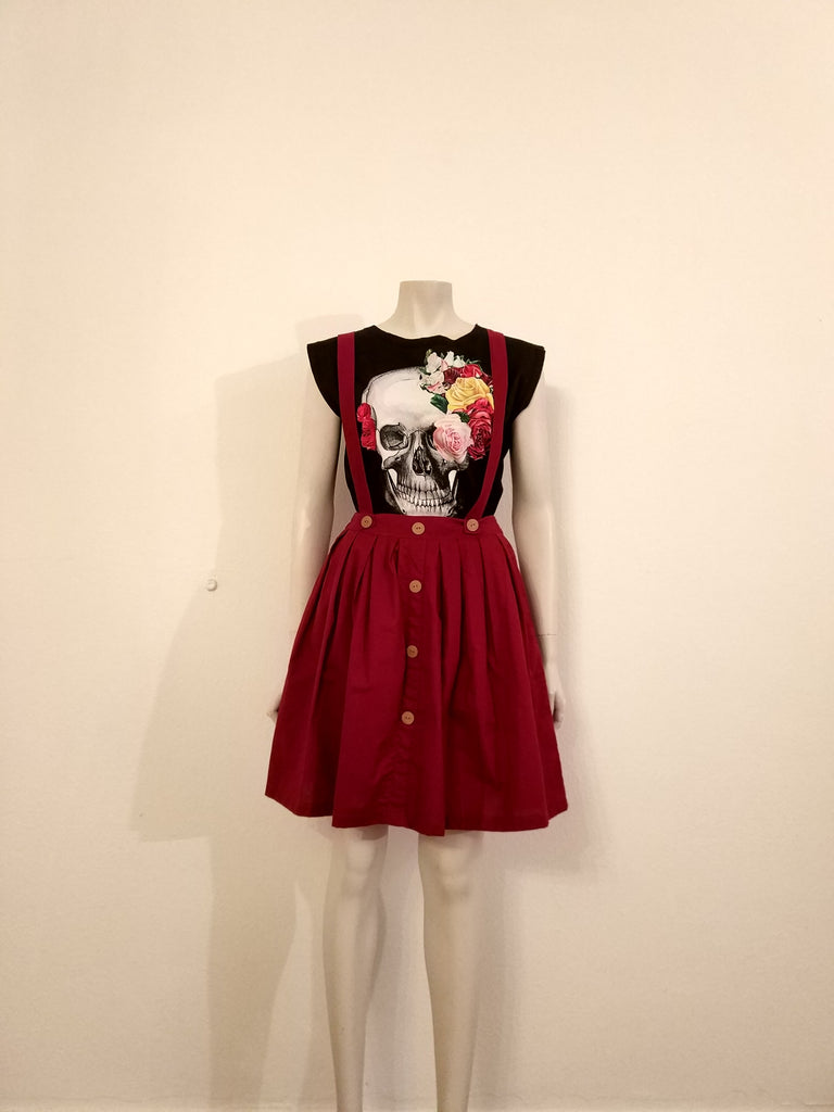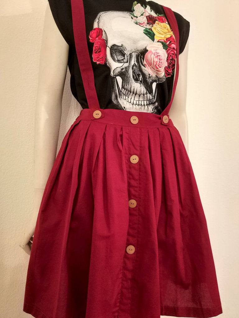 ONE SIZE fitting women that are in the size range 34 till 40. The skirt has a zipper on the side and an elastic band on the back. The suspenders are not adjustable in length but they have two button holes to change the height so it the skirt can even be worn higher than on picture. The model wearing this skirt is 168 cm tall.